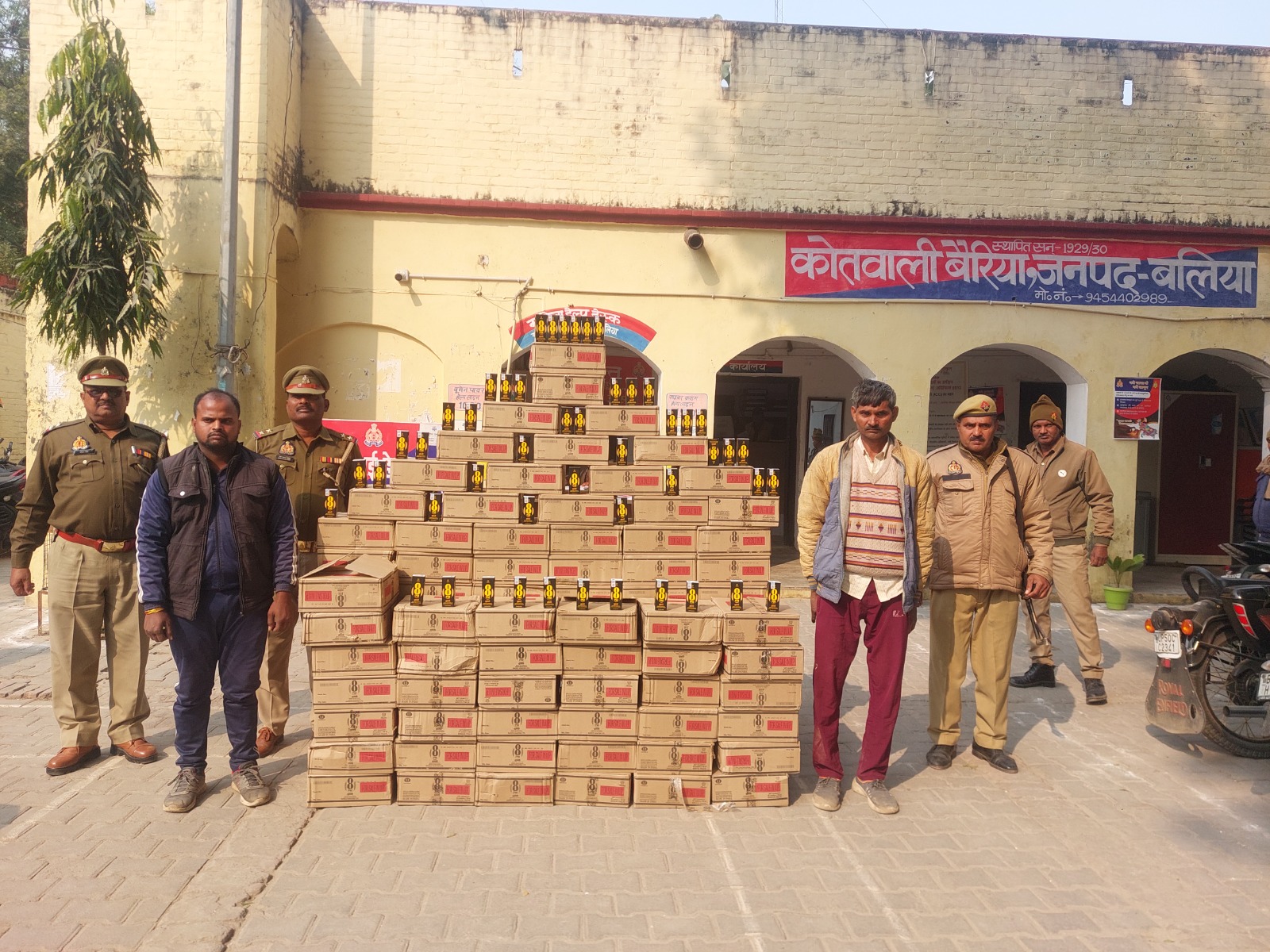 उल्लेखनीय है कि दिनांक 27.01.2025 को समय 23.55 बजे थाना बैरिया पुलिस टीम के निरीक्षक सुशील कुमार दूबे व उ0नि0 श्री राम प्रसाद बिन्द एवं उ0नि0 श्री परमात्मा मिश्रा मय हमराह रोकथाम जुर्म जरायन चेकिंग सदिग्ध व्यक्ति वाहन मामूर थे कि मुखविर खास द्वारा सूचना प्राप्त हुई कि सरकारी मदिरा की दुकान पर बेची जाने वाली अंग्रेजी शराब के साथ बारकोड मे छेड़छाड़ व छल करके धोखाधड़ी से विहार राज्य के विभिन्न जनपदो में अवैध रूप से विक्री हेतु शराब तस्कर द्वारा विहार प्रान्त में नदी के रास्ते ले जाया जा रहा है। यदि शीघ्रता किया जाये तो पकड़े जा सकते है इस सूचना पर विश्वास करके मय पुलिस टीम द्वारा वहां पहुंचकर टार्च की रोशनी मे देखा गया तो वहां कई लोग खड़े हैं कि पुलिस टीम को आता देखकर अंग्रेजी शराब की बोरीयों को मौके पर छोड़कर भागने लगे कि दौड़ाकर घेरकर हिकमत अमली से शराब की बोरियों सहित 02 व्यक्तियों 1.संजय चौरसिया पुत्र छितेश्वर चौरसिया निवासी ग्राम शिवन टोला (लक्ष्मी नारायण मंदिर) थाना बैरिया जनपद बलिया उम्र करीब 40 वर्ष 2.संजीत कुमार पुत्र बीरेन्द्र यादव निवासी ग्राम चाँददियर (यादव बस्ती) थाना बैरिया जनपद बलिया उम्र करीब 25 वर्ष। को पकड़ लिया गया जिसके कब्जे से 02 बोरीयो मे 6 -6 पेटी व 12 बोरीयों मे 5-5 पेटी (कुल 72 पेटी) अवैध अंग्रेजी शराब 8PM फ्रूटी प्रत्येक 180 ML कुल 3456 अदद कुल 622.08 ली0 जिसकी कीमत लगभग 414720 रु0 बरामद हुआ जिनके विरूद्ध थाना स्थानीय पर मु0अ0सं0-034/2025 धारा 318(2),319(2),61(2)a B.N.S व 60/63 आबकारी अधि0 पंजीकृत किया गया। थाना स्थानीय द्वारा अन्य आवश्यक कार्यवाही पूर्ण कर अभियुक्तगण के मा0 न्यायालय भेजा गया ।