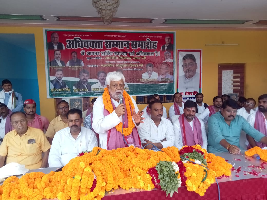 रोहनिया । समाजवादी पार्टी अधिवक्ता सभा द्वारा चितईपुर स्थित पेट्रोल पंप के बगल में बसंती वाटिका में आयोजक समाजवादी पार्टी अधिवक्ता सभा के प्रदेश सचिव एडवोकेट सुनील कुमार सिंह के नेतृत्व में तथा एमएलसी आशुतोष सिन्हा की अध्यक्षता में आयोजित अधिवक्ता सम्मान समारोह कार्यक्रम का शुभारंभ मुख्य अतिथि सिकंदर यादव प्रदेश अध्यक्ष अधिवक्ता सभा समाजवादी पार्टी उत्तर प्रदेश तथा विशिष्ट अतिथि सपा जिलाध्यक्ष सुजीत यादव उर्फ लक्कड़ पहलवान, चंदौली के सांसद वीरेंद्र सिंह, पूर्व राज्य मंत्री सुरेंद्र सिंह पटेल ने संयुक्त रूप से दीप प्रज्वलन कर किया। कार्यक्रम को संबोधित करते हुए मुख्य अतिथि समाजवादी पार्टी अधिवक्ता सभा प्रदेश अध्यक्ष सिकंदर यादव ने प्रदेश सरकार के कानून व्यवस्था पर तीखा प्रहार करते हुए कहा कि अधिवक्ता ही समाज का दर्पण होते हैं यह सरकार अधिवक्ताओं के साथ दुर्व्यवहार कर रही है। उन्होंने अधिवक्ताओं के हितों की रक्षा का वादा किया। पूर्व राज्य मंत्री सुरेंद्र सिंह पटेल ने कहा कि आगामी चुनाव में अधिवक्ता समाज के लोगों को एकजुट होकर पार्टी को मजबूती प्रदान करते हुए राष्ट्रीय अध्यक्ष अखिलेश यादव को उत्तर प्रदेश का मुख्यमंत्री बनाने में पूरा सहयोग प्रदान करना होगा। एमएलसी आशुतोष सिन्हा ने कहा कि अधिवक्ताओं की लड़ाई सड़क से लेकर सदन तक लड़ी जाएगी। कार्यक्रम के दौरान प्रदेश सचिव अधिवक्ता सभा सुनील सिंह ने आए हुए समस्त अतिथियों एवं पार्टी के पदाधिकारी व कार्यकर्ताओं को अंग वस्त्र के साथ स्मृति चिन्ह देकर सम्मानित किया। कार्यक्रम का संचालन तहसीलबार एसोसिएशन राजातालाब के पूर्व अध्यक्ष सर्वजीत भारद्वाज तथा धन्यवाद ज्ञापन पूर्व जिलाध्यक्ष आत्माराम यादव ने किया। कार्यक्रम में प्रमुख रूप से प्रदेश महासचिव अधिवक्ता सभा अमित कुमार यादव, पूर्व अध्यक्ष सेंट्रल बार एसोसिएशन मोहन यादव, घनश्याम पटेल, पूर्व विधायक रोहनिया महेंद्र सिंह पटेल, राम सिंह यादव ,कन्हैयालाल राजभर, गोपाल यादव, रामप्रकाश मास्टर, जिलाध्यक्ष महिला सभा शशि यादव, राजेश उर्फ नत्थू यादव, हरीश मिश्रा, पूर्व मंत्री बनारस बार अशोक राय, अरविंद राय, राजन राय, छेदी यादव, प्रदीप सिंह, विकास यादव, जयप्रकाश यादव जेपी, आनंद पटेल ,रामजी पटेल इत्यादि अधिवक्ता एवं पार्टी के पदाधिकारी व कार्यकर्ता गण उपस्थित रहे।