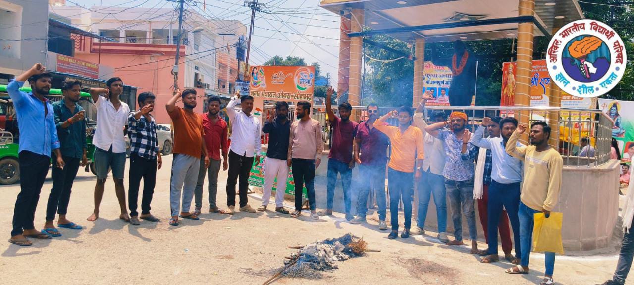 सोनभद्र- अखिल भारतीय विद्यार्थी परिषद ओबरा नगर इकाई के द्वारा सुभाष चौराहे पर नगर मंत्री ऋषभ राज यादव के नेतृत्व में ममता सरकार का प्रतीकात्मक पुतला जलाकर जमकर नारेबाजी कर विरोध जताया गया ।