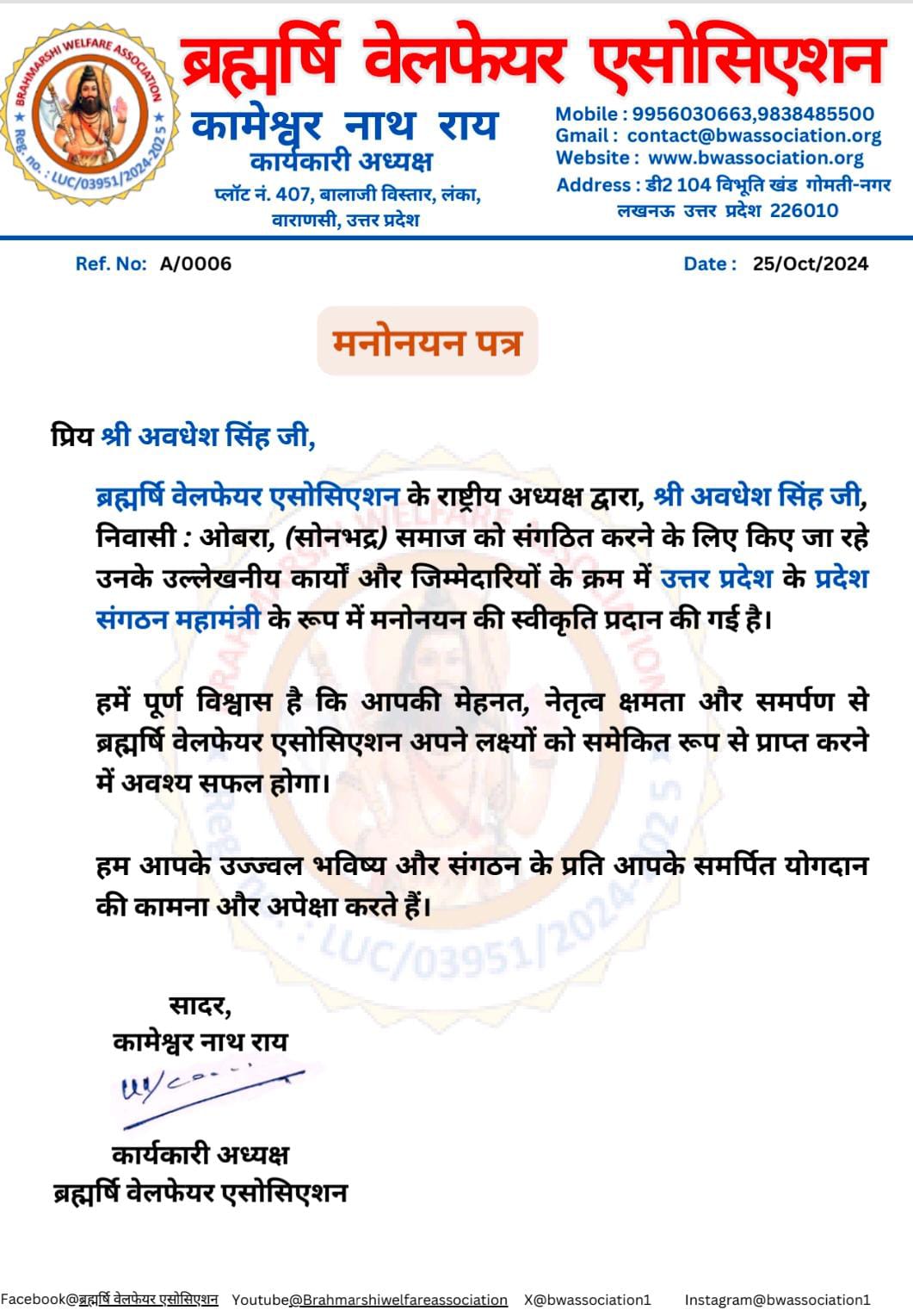 सोनभद्र । ब्रह्मर्षि वेलफेयर एसोसिएशन के राष्ट्रिय कार्यकारी अध्यक्ष कामेश्वर नाथ राय ने संगठन की मजबूती के लिए ओबरा शिक्षा समिति के अध्यक्ष अवधेश कुमार सिंह को प्रांतीय संगठन मंत्री के पद पर नियुक्त किया है। राष्ट्रिय कार्यकारी अध्यक्ष द्वारा नियुक्त के साथ अवधेश कुमार सिंह को बधाई और शुभकामना भी दिया है।