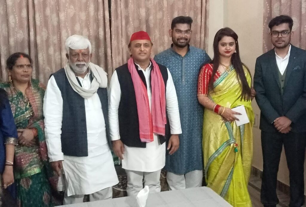 पूर्व मुख्यमंत्री अखिलेश यादव ने पूर्व राज्य मंत्री सुरेंद्र पटेल के नव विवाहित पुत्र व वधु को दिया आशीर्वाद