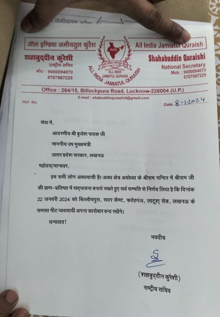 लखनऊ में मांस की दुकानें चलाने वाले ऑल इंडिया जमीअतुल कुरैश के संगठन ने इस मामले में उप मुख्यमंत्री ब्रजेश पाठक को पत्र लिखा है।