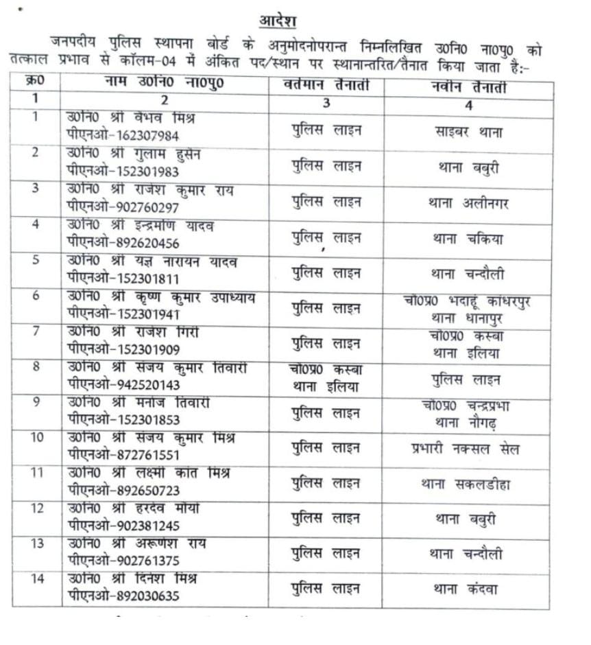चंदौली। चंदौली में एक बार फिर से पुलिस महकमे में फेरबदल किया गया है। चंदौली पुलिस अधीक्षक आदित्य लांघे ने 14 उप निरीक्षकों के कार्य क्षेत्र में फेरबदल किया है जिसमे पुलिस लाइन में तैनात 13 दारोगाओं को थानों में तैनाती दी गई है तो वहीं इलिया कस्बा चौकी प्रभारी संजय कुमार तिवारी को लाइन हाजिर कर दिए गए हैं। राजेश गिरी इलिया चौकी के नए प्रभारी बनाए गए हैं। कृष्ण कुमार उपाध्याय धानापुर की भदाहू चौकी के नए प्रभारी होंगे।