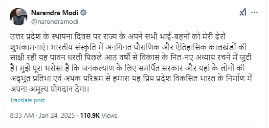 25 January 2025 Editor Desh Videsh दिल्ली: प्रधानमंत्री नरेंद्र मोदी ने उत्तर प्रदेश के 76वें स्थापना दिवस पर प्रदेशवासियों को बधाई दी। उन्होंने कहा, “यूपी के सभी भाई-बहनों को मेरी शुभकामनाएं।” पीएम मोदी ने उत्तर प्रदेश में जनकल्याण के लिए समर्पित सरकार की सराहना करते हुए कहा कि “विकसित भारत निर्माण में यूपी का अमूल्य योगदान है।” खबर को शेयर करे Latest articles फर्जी आर्मी ऑफिसर बनकर नौकरी दिलवाने के नाम पर ठगी करने वाले को एसटीएफ ने किया गिरफ्तार Editor बार-बार यातायात नियमों का उल्लंघन करने वाले चालकों के विरुद्ध ड्राइविंग लाइसेंस निलंबन तथा गंभीर मामलों में निरस्तीकरण की कार्रवाई की जाए-सत्येंद्र कुमार Editor गंगाजमुनी तहजीब के तहत अधिवक्ताओ द्वारा आयोजित भव्य अधिवक्ता स्नेह मिलन समारोह में उमड़ा अधिवक्ताओ का सैलाब Editor