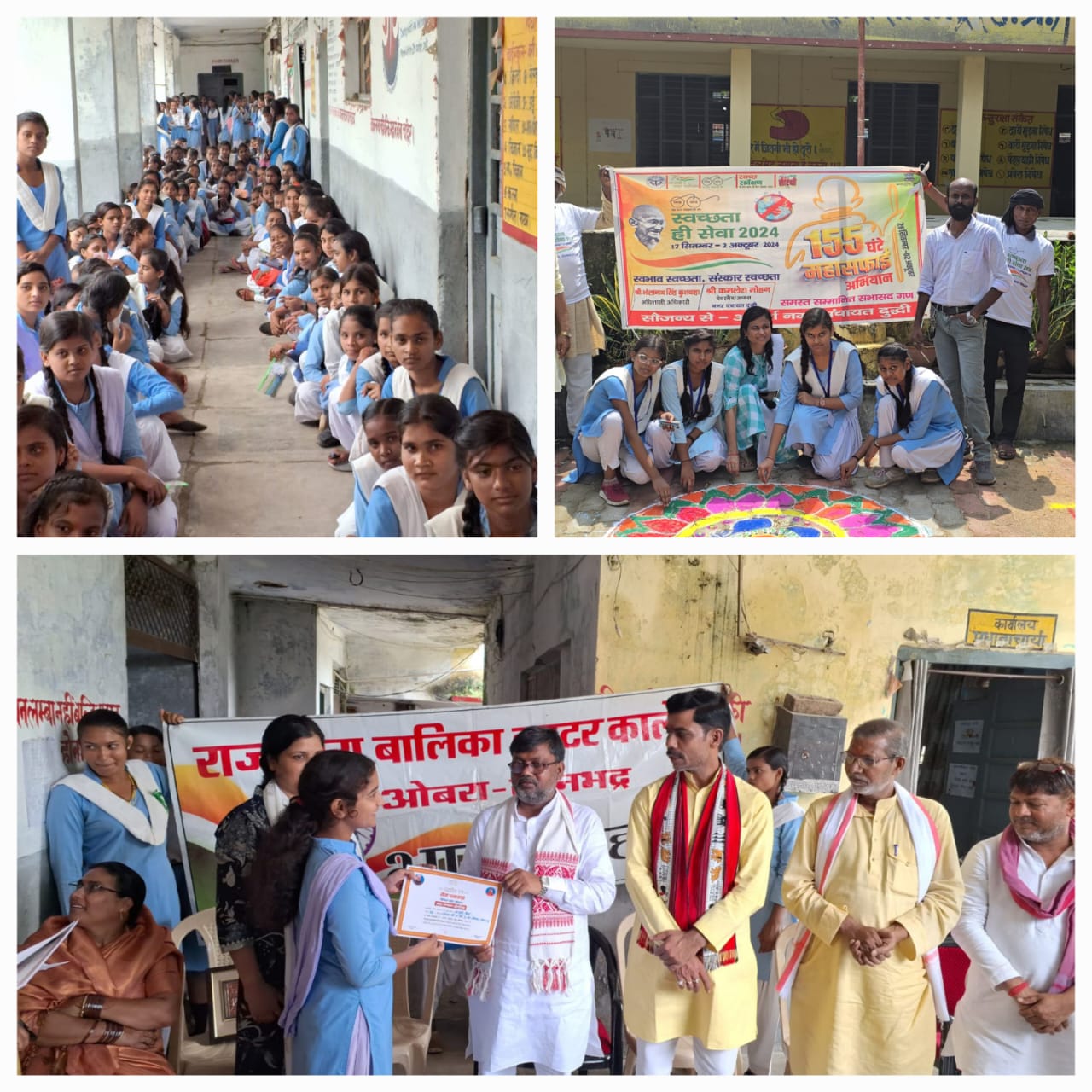 ओबरा/ सोनभद्र – स्थानीय नगर के में भाजपा द्वारा 17 सितम्बर से 2 अक्टूबर तक चलाए जा रहे ” सेवा पखवाड़ा आभियान ” के अन्तर्गत राजकीय बालिका इंटर कॉलेज ओबरा सोनभद्र में “स्वच्छता पखवाड़ा ” के तहत निबन्ध प्रतियोगिता का आयोजन किया गया। जिसके मुख्य अतिथि भाजपा के जिला अध्यक्ष नन्दलाल गुप्ता रहें। इस अवसर पर कालेज की बालिकाओं ने निबन्ध प्रतियोगिता कार्यक्रम के अन्तर्गत प्रतिभाग करते हुए प्रथम,द्वितीय एवं तृतीय स्थान प्राप्त किया। इस अवसर पर मुख्य अतिथि ने सभी छात्राओं को प्रमाण पत्र वितरित किया। इस अवसर पर उमेश सिंह पटेल, ओबरा मण्डल अध्यक्ष सतीश कुमार पाण्डेय,शिव नाथ जयसवाल,डॉक्टर भावना शुक्ला, अनुपम देवी, सोनी साहनी, सैनी मिश्रा, गरिमा बाला, अल्का वर्मा, दुर्गावती देवी, रमेश सिंह यादव, इत्यादि लोग उपस्थित रहे।
