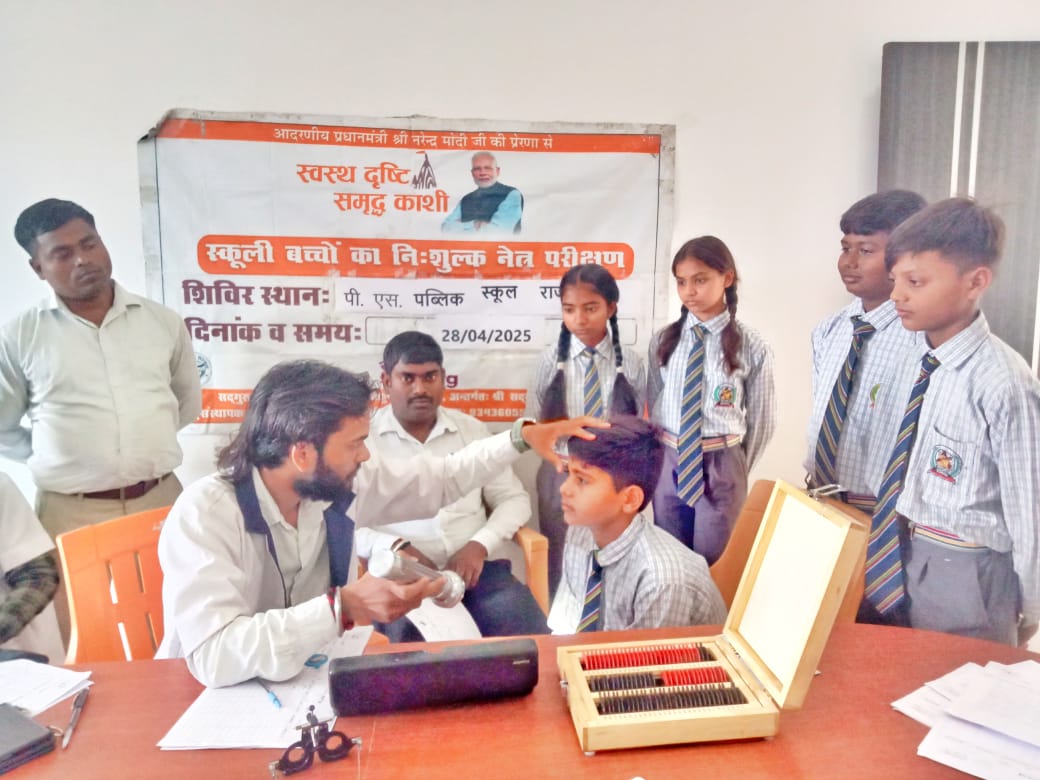 राजातालाब।आराजी लाइन विकासखंड क्षेत्र के मेहंदीगंज राजातालाब स्थित पी एस पब्लिक स्कूल में सोमवार को चेयरमैन अमरनाथ पटेल की देखरेख में प्रधानमंत्री नरेंद्र मोदी जी के प्रेरणा से स्वस्थ्य दृष्टि समृद्धि काशी के तहत आयोजित शिविर के दौरान नेत्र विशेषज्ञ डॉक्टर शशि चंद्रा द्वारा विद्यालय के लगभग चार सौ बच्चों का निशुल्क नेत्र परीक्षण किया गया। शिविर के दौरान डॉक्टरों द्वारा बच्चों को नेत्र स्वास्थ्य से जुड़ी आवश्यक खान पान व देखरेख की सलाह दी गई।डायरेक्टर दिनेश पटेल ने डॉक्टरो का आभार व्यक्त करते हुए बताया कि इस पहल का मुख्य उद्देश्य विद्यार्थियों के बेहतर स्वास्थ्य और उज्जवल भविष्य को सुनिश्चित करना है। शिविर के दौरान मुख्य रूप से डायरेक्टर दिनेश पटेल, मैनेजर उत्तम पटेल, प्रिंसिपल कल्पना शर्मा, नागेंद्रा,शिवम इत्यादि अध्यापक गण सहित सतगुरु नेत्र चिकित्सालय की टीम उपस्थित रहे।