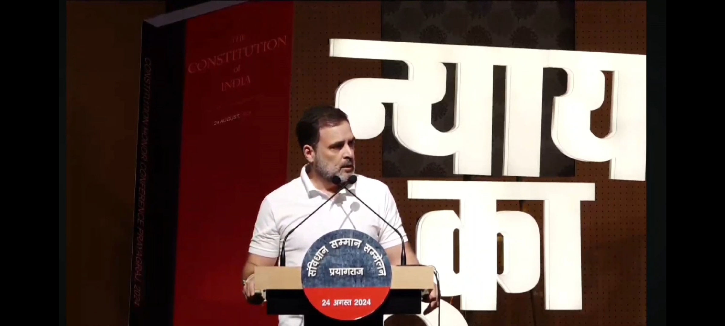 उत्तर प्रदेश के प्रयागराज में संविधान सम्मान सम्मेलन को संबोधित करते हुए कांग्रेस नेता और लोकसभा में विपक्ष के नेता राहुल गांधी ने कहा कि देश के 90 प्रतिशत लोगों की सिस्टम में कोई भागीदारी नहीं है, फिर भी हम कहते हैं कि देश सुपर पावर बन जाएगा। संविधान लागू होने के 70 साल बाद भी देश की 90 प्रतिशत आबादी हाशिए पर है और कॉरपोरेट जगत, मीडिया एवं न्यायपालिका में उनकी भागीदारी नहीं है। वे चाहते हैं कि दलितों, पिछड़ों और आदिवासियों को भी समान भागीदारी और अधिकार मिलें तथा देश के संसाधनों पर उनका नियंत्रण हो।