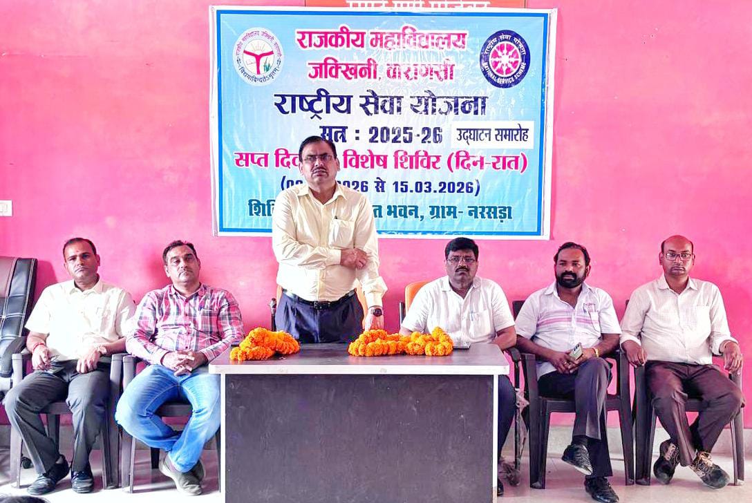 राजातालाब। राजकीय महाविद्यालय जक्खिनी की राष्ट्रीय सेवा योजना इकाई के तत्वावधान मे नरसड़ा ग्राम में रा. से. यों. के सप्त दिवसीय विशेष शिविर का उद् घाटन समारोह सुसंपन्न हुआ। कार्यक्रम की अध्यक्षता महाविद्यालय के प्राचार्य प्रो. (डॉ0) संतोष सिंह ने किया। प्राचार्य प्रो. (डॉ0) संतोष सिंह ने अपने अध्यक्षीय उद बोधन में कहा कि राष्ट्रीय सेवा योजना का मुख्य लक्ष्य स्वयंसेवकों के व्यक्तित्व एवं चरित्र का निर्माण है। स्वयंसेवक सामुदायिक भावना से प्रेरित होकर स्वच्छता, साक्षरता, बालिका शिक्षा, मतदाता जागरूकता आदि संबंधी कार्यक्रमों बढ़ चढ़कर प्रतिभाग करें।कार्यक्रम के मुख्य अतिथि नरसड़ा ग्राम के संजय मिश्रा रहे।इन्होने स्वयंसेवकों को समाज सेवा, देश प्रेम और गरीब-कमजोर तबके के उत्थान मे सहायक होने की सलाह दी। राष्ट्रीय सेवा योजना के कार्यक्रम अधिकारी डॉ आनंद सिंह ने स्वयंसेवकों को राष्ट्रीय सेवा योजना के संक्षिप्त इतिहास, उद्देश्य, प्रतीक चिन्ह और प्रेरणा पुरुष आदि के बारे में विस्तार से बताया। उन्होंने स्वयंसेवकों में समाज सेवा के माध्यम से उनके व्यक्तित्व, चरित्र एवं नेतृतव के विकास पर बल दिया। तत्पश्चात कार्यक्रम अधिकारी डॉ आनंद सिंह के नेतृत्व में स्वयंसेवकों व स्वयंसेविकाओं ने नरसड़ा गांव में अपने कैंप के चारों तरफ स्वच्छता अभियान चलाकर श्रमदान किया।