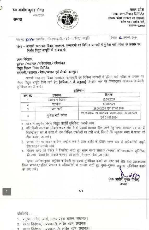 `15,19,23,24,25,26,27,30 और 31 अगस्त को लगातार बिजली आपूर्ति सुनिश्चित करने के निर्देश।