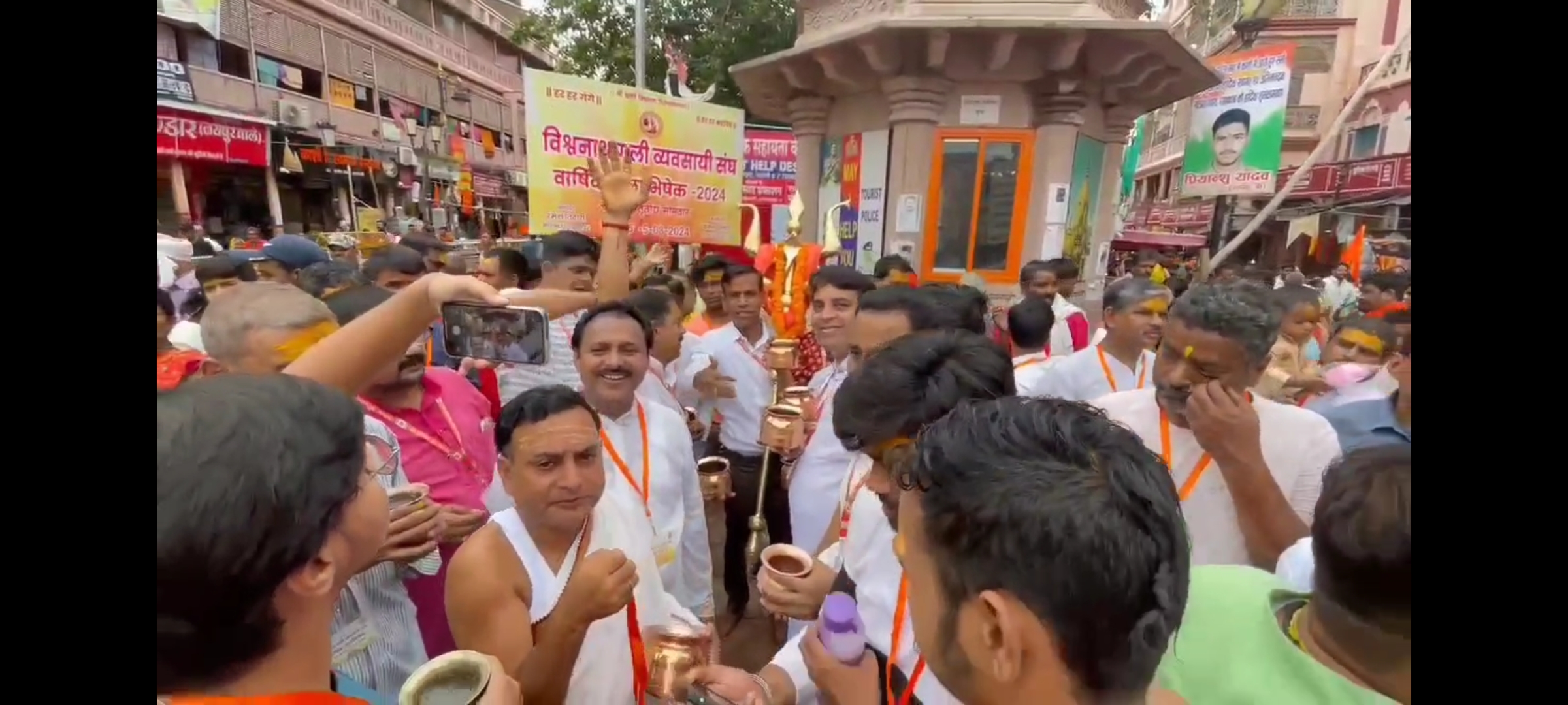वाराणसी/05/जुलाई 2024/ प्रतिवर्ष की भांति इस वर्ष भी सावन के तीसरे सोमवार को विश्वनाथ गली व्यवसायी संघ के बैनर तले विश्वनाथ गली के व्यपारीयों ने बाबा विश्वनाथ का जलाभिषेक किया। जलाभिषेक कार्यक्रम के पहले विश्वनाथ गली के व्यापारीयों का समुह दशाश्वमेध स्थित चित्तरंजन पार्क पर इक्कठा होकर शोभायात्रा के रूप में डमरूओं की गड़गडाहट एंव शंखनाद के साथ सिंह द्वार,विश्वनाथ गली होते हुए काशी विश्वनाथ मंदिर पहुंच कर बाबा का जलाभिषेक किया।जलाभिषेक शोभायात्रा के पुर्व 11 वैदिक ब्राह्मणों द्वारा काशी के 84 घाटों के साथ काशी के 12 प्राचीन पौराणिक कुंडों क्रमानुसार चक्र-पुष्करणी (मणिकर्णिका घाट), लोलार्क कुंड (अस्सी), कुरूक्षेत्र कुंड (भदैनी-अस्सी), क्री-कुंड (रवीन्द्रपुरी कालोनी), मन्दाकिनी कुंड (कंपनीबाग), दुर्गाकुंड (दुर्गामंदिर), रामकुंड (श्री नगर कालोनी),  लक्ष्मीकुंड (लक्सा), सुरजकुंड (पानदरीबा), पितरकुंडा (लल्लापुरा), पिशाचमोचन (मलदहिया), द्वारकाकुंड (शंकुलधारा) के जलों के कलशों का पुजन किया। पुजन के बाद हजारों की संख्या उपस्थित व्यापारी बंधु व परिवार की महिलाएं व पुरुष कलशों को लेकर बाबा विश्वनाथ का जलाभिषेक करने रवाना हुये।