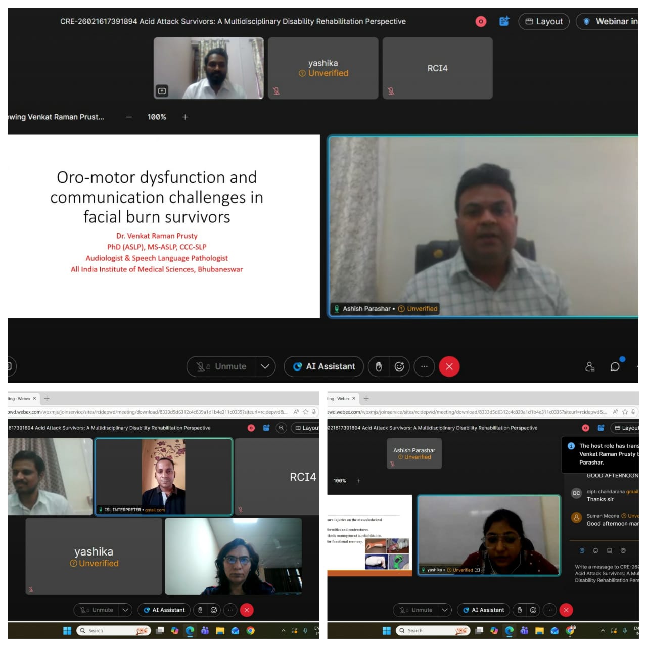 कार्यक्रम के दौरान देश के प्रतिष्ठित संस्थानों के विशेषज्ञों ने अपने विचार साझा किए । प्रथम सत्र एम्स, भुवनेश्वर के ई.एन.टी. विभाग से डॉ. वेंकट रमन प्रुस्टी (ऑडियोलॉजिस्ट और स्पीच लैंग्वेज पैथोलॉजिस्ट) ने “चेहरे के जलने से प्रभावित व्यक्तियों में ओरो-मोटर डिसफंक्शन और संचार चुनौतियों” पर विस्तार से प्रकाश डाला। द्वितीय सत्र आई.एस.आई.सी.-इंस्टीट्यूट ऑफ रिहैबिलिटेशन साइंसेज, नई दिल्ली की याशिका कुमार (असिस्टेंट प्रोफेसर, पी&ओ) ने “एसिड से जलने के कारण होने वाली दिव्यांगता में व्यापक ऑर्थोटिक प्रबंधन” विषय पर जानकारी दी। तृतीय सत्र जे.सी.सी. रोहिणी, दिल्ली की तन्नू गेरा , पुनर्वास मनोवैज्ञानिक एवं असिस्टेंट प्रोफेसर ने “एसिड अटैक का मनोवैज्ञानिक प्रभाव और मानसिक स्वास्थ्य पुनर्वास” विषय पर प्रतिभागियों का मार्गदर्शन किया।