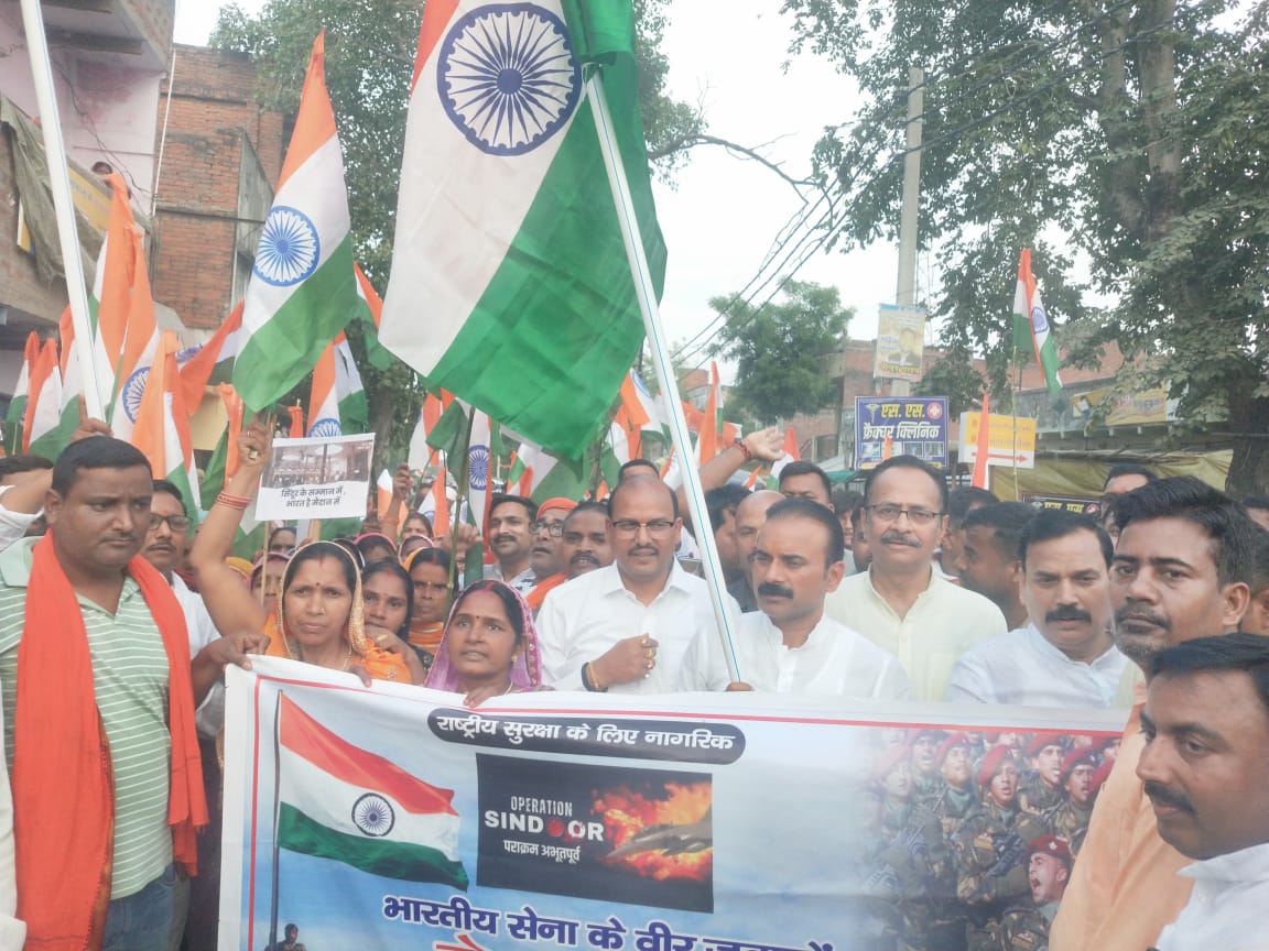 कमालपुर कस्बा स्थित रामलीला मैदान से तिरंगा यात्रा निकला और पुरे भीतरी बाजार होते हुए स्वतंत्रता सेनानी हरिनरायण अग्रहरी गेट पर जाकर समाप्त हुई भारतीय सेना ने ऑपरेशन सिंदूर के माध्यम जिस बहादुरी के साथ पाकिस्तानी सेना को मार गिराने का काम किया।वह बहुत ही सराहनीय रहा है।आज हर भारतीय गौरवान्वित महसूस कर रहा है।दुश्मनों को उनके भाषा ने जवाब देकर भाजपा ने देश की एकता को बनाए रखने का काम किया है।सयदराजा विधायक सुशील सिंह ने कहा जो पराक्रम भारतीय सेना की ताकत का नमूना पाकिस्तान ने देख चुका है।आपरेशन सिंदूर के माध्यम से हमारी सेना ने जो कार्रवाई किया है।उसका लोहा पूरी दुनिया मान रही है।हमारी सेना ने ऑपरेशन सिंदूर से पूरी दुनिया में देश का मान सम्मान बढ़ाया है।आज उनके सम्मान में तिरंगा यात्रा निकालने का काम किया जा रहा है।इसके तहत आज शाम 5 बजे से तिंरगा यात्रा रामलीला मैदान से भीतरी बाजार होते हुए हरिनारायण अग्रहरि स्वतंत्रता सेनानी द्वार पर समाप्त हुआ ।इस दौरान तिरंगा यात्रा में शामिल होकर देश की एकता व अखंडता को बनाए रखने में लोगों ने भरपूर सहयोग किया ।उक्त कार्यक्रम में सैयदराजा विधायक सुशील सिंह,ब्लॉक प्रमुख धानापुर अजय सिंह,पूर्व जिपंस सुशील सिंह जनौली राजेश सिँह गुददर सिँह, काशी सिँह, विपिन राय चंद्रभान राय, सुबास राय, दिलीप सिँह राजू राय, गडेश अग्रहरी, भरत निगम,डा0 वेदब्यास राय, विकास गुप्ता सहित भाजपा के पदाधिकारी व कार्यकर्ता रहें।