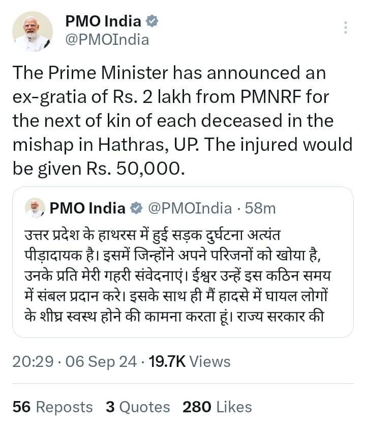 प्रधानमंत्री कार्यालय द्वारा दी गई जानकारी के अनुसार, हादसे में जान गंवाने वाले प्रत्येक व्यक्ति के परिजनों को 2-2 लाख रुपये की आर्थिक सहायता दी जाएगी, जबकि घायलों को 50-50 हजार रुपये की मदद दी जाएगी। इस दुर्घटना ने पूरे क्षेत्र को गहरे शोक में डाल दिया है, और सरकार द्वारा इस घटना का संज्ञान लेते हुए तुरंत सहायता की पहल की गई है।