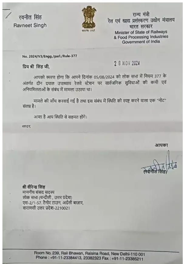 चंदौली जिले के सांसद वीरेन्द्र सिंह के द्वारा पंडित दीनदयाल उपाध्याय रेलवे स्टेशन की सुविधाओं को लेकर उठाए गए मुद्दों पर रेलवे ने सकारात्मक कदम उठाते हुए उनकी मांगों को स्वीकृत किया है। सांसद ने लोकसभा में नियम 377 के तहत यह मामला उठाया था, जिसके बाद रेलवे राज्य मंत्री रवनीत सिंह ने इस पर जवाब दिया और कहा कि कई सुधारात्मक कदम उठाए जाएंगे।