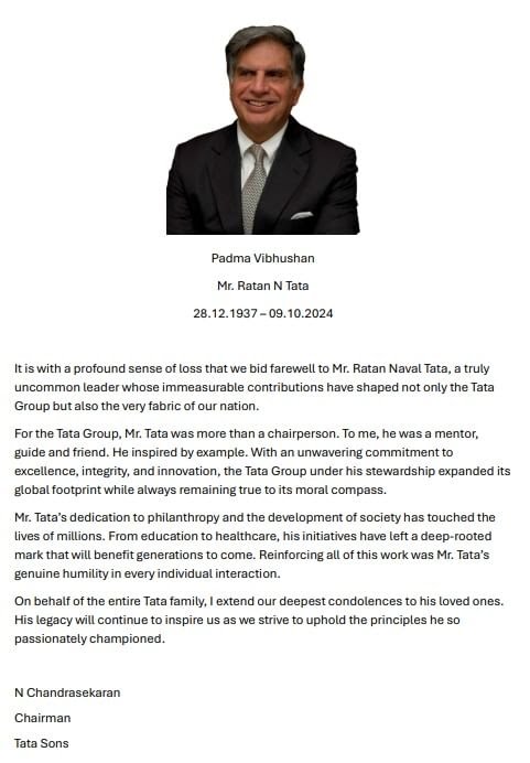 रतन टाटा का योगदान भारतीय उद्योग और समाज दोनों के लिए अमूल्य रहा है। उनकी विरासत हमेशा भारतीय कॉर्पोरेट जगत में प्रेरणादायक रहेगी।