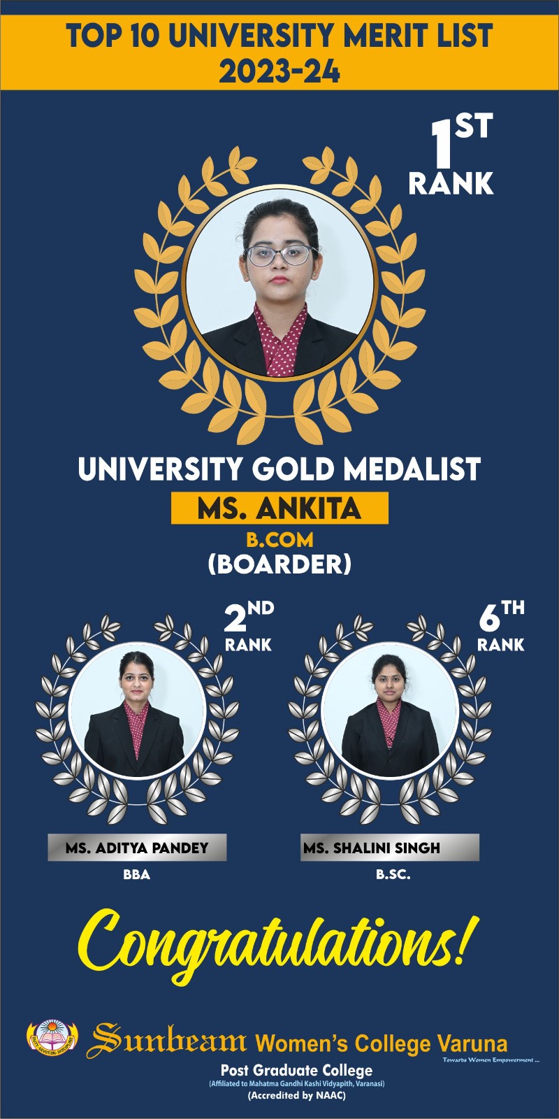 वाराणसी के सनबीम वरुणा विमेंस कॉलेज, जो महात्मा गांधी काशी विद्यापीठ यूनिवर्सिटी से एफिलिएटेड है, की छात्रा शालिनी सिंह ने बीएससी में छठा स्थान प्राप्त किया है। शालिनी की इस शानदार उपलब्धि के लिए उन्हें कॉलेज के दीक्षांत समारोह में भारत के राष्ट्रपति द्वारा मेडल से सम्मानित किया जाएगा।