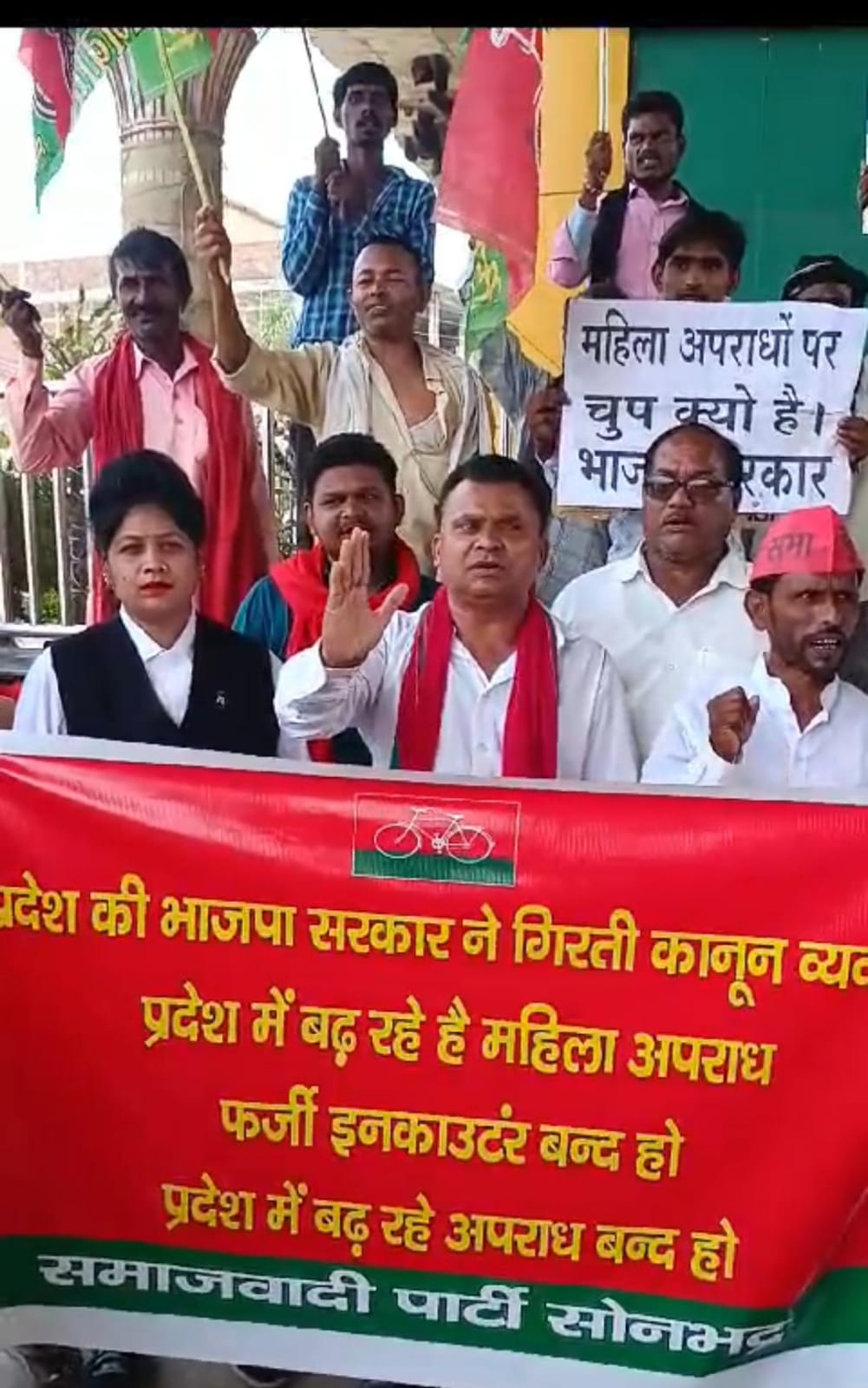 समाजवादी पार्टी के जिला सचिव प्रमोद यादव ने कहा की महिला उत्पीड़न और हो रहे है फर्जी इनकाउंटर,अन्याय अपराध पर मौन क्यों है भाजपा सरकार ।समाजवादी पार्टी महिला प्रकोष्ठ की जिला अध्यक्ष गीता गौर ने कहा कि सोनभद्र मे दुद्धी की लड़की का गैगं रेप, हाथरस की घटना, उन्नाव की घटना किसी से छिपा नहीं है और एक तरफ प्रदेश की भाजपा सरकार कानून व्यवस्था ठीक होने की बात करती है जबकि लगातार प्रदेश मे हत्या लूट बलात्कार अपराध बढ़ रहे है व्यापारी परेसान,