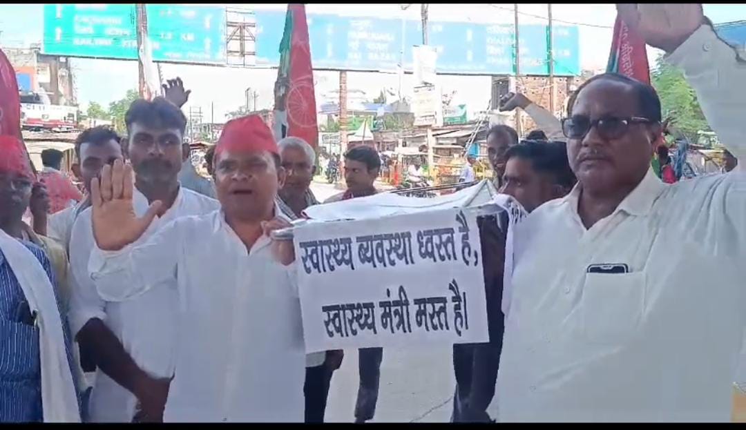 सोनभद्र- समाजवादी पार्टी के कार्यकर्ताओं ने स्वर्ण जयंती चौक पर स्वास्थ्य दुर्व्यवस्था संबंधि समस्याओ को लेकर स्वास्थ्य मंत्री के विरोध में प्रदर्शन किया