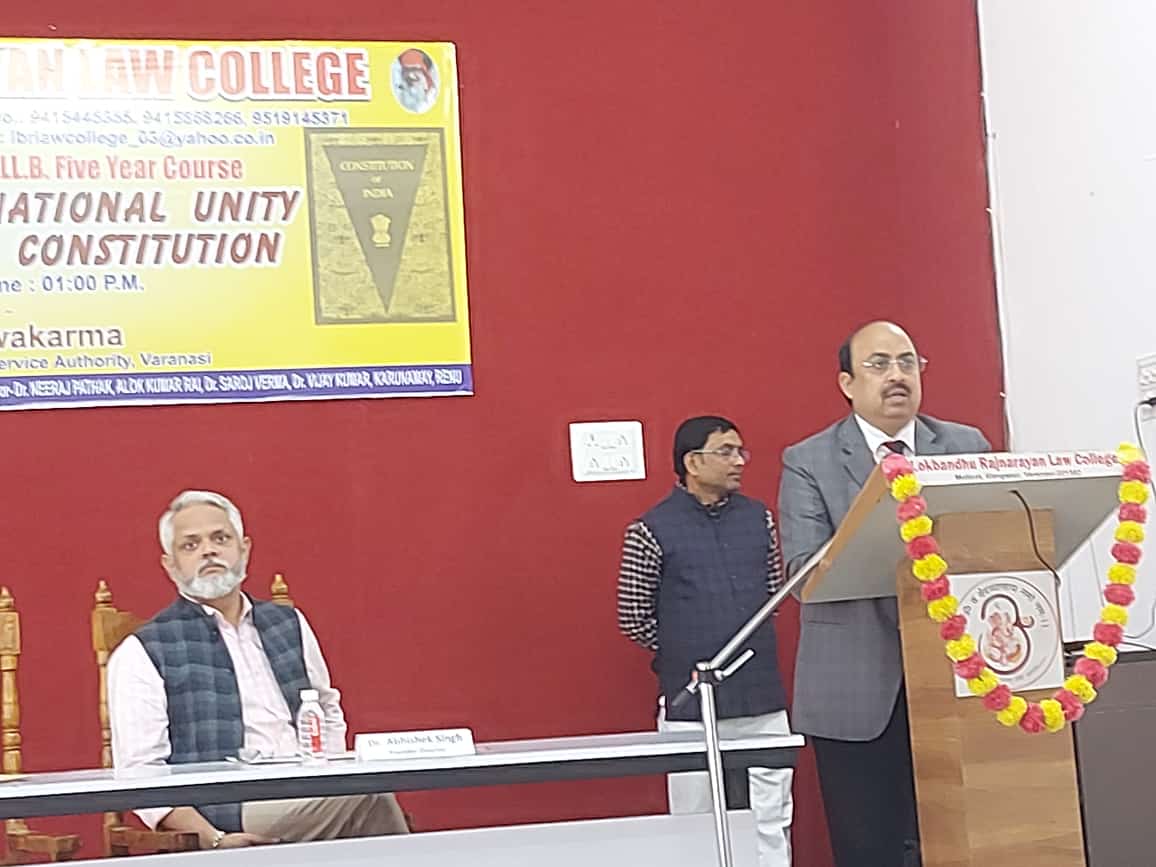 राजातालाब।75 वें संविधान दिवस के अवसर राजनारायण विधि महाविद्यालय मोतीकोट गंगापुर में ’’संविधान एवं राष्ट्रीय एकता’’ विषय पर एक संगोष्ठी का आयोजन किया गया। जिसका शुभारंभ मुख्य अतिथि विजय कुमार विश्वकर्मा अपर जिला जज एवं सचिव जिला विधिक सेवा प्राधिकरण वाराणसी ने दीप प्रज्वलित करके किया। इस अवसर पर उन्होंने जिला विधिक सेवा प्राधिकरण द्वारा संचालित विभिन्न प्रकार की योजनाओं जैसे संविधान में प्रदत अनुच्छेद 39ए के अंतर्गत निशुल्क विधिक सहायता, दुष्कर्म पीड़िता को आर्थिक मदद, कारागार में निरुद्ध कैदियों के जमानत के लिए आर्थिक मदद, दुर्घटना में मृत व्यक्तियों के परिवार को अनुकंपा एवं मध्यस्थम के माध्यम से निपटारा आदि के बारे में बताया। महाविद्यालय के प्राध्यापक डॉ0 विजय कुमार ने कहा कि संविधान की प्रस्तावना में ही संविधान की मूल भावना निहित है तथा न्याय की प्रासंगिकता को अच्क्षुण्य बनाए रखने के लिए मामलों के त्वरित निस्तारण करने का अनुरोध किया।महाविद्यालय के छात्र वर्ग से सोनू पटेल, नितेश पाल एवं छात्रा वर्ग से सुष्मिता उपाध्याय, निकिता जायसवाल एवं प्रसिद्धि खरे ने अपने विचार व्यक्त किया। कार्यक्रम की अध्यक्षता कर रहे महाविद्यालय के निदेशक डॉ0 अभिषेक सिंह ने अपने विचारों को व्यक्त करते हुए कहा कि संविधान की गरिमा बनाए रखने के लिए सुशासन, आचरण, नीतियॉ तथा सर्वाेच्च न्यायालय की भूमिका अत्यंत महत्वपूर्ण है तथा संविधान कानूनी दस्तावेज के साथ-साथ सामाजिक दस्तावेज भी है। महाविद्यालय द्वारा प्रायोजित इंटर्नशिप प्रोग्राम में सफलतापूर्वक प्रतिभाग करने वाले छात्रों को मुख्य अतिथि के कर कमलों द्वारा प्रमाण पत्र प्रदान किया गया। कार्यक्रम के अंत में महाविद्यालय के संस्थापक निदेशक द्वारा मुख्य अतिथि महोदय को स्मृति एवं अंगवस्त्र प्रदान करके सम्मानित किया गया। कार्यक्रम की अध्यक्षता महाविद्यालय के निदेशक डॉ अभिषेक सिंह एवं संचालन प्राध्यापक डा0 अरविंद कुमार ने किया इस अवसर पर महाविद्यालय के प्राध्यापक डा0 आलोक कुमार राय, डा0 नीरज पाठक सरोज वर्मा, डा0 विजय कुमार, करुणामय, समस्त कर्मचारी एवं छात्र-छात्राएं उपस्थित रहे।