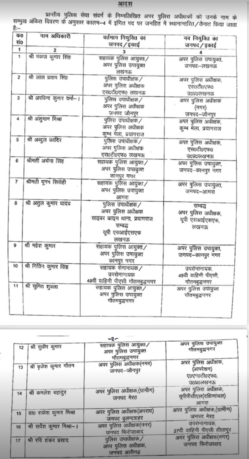 जिन अफसरों के तबादले किए गए हैं, उनमें एसीपी लखनऊ पुलिस कमिश्नरेट पंकज कुमार सिंह एडीसीपी लखनऊ पुलिस कमिश्नरेट, डिप्टी एसपी एसटीएफ लाल प्रताप सिंह एएसपी एसटीएफ, डिप्टी एसपी जौनपुर अरविंद कुमार वर्मा प्रथम एएसपी सिटी जौनपुर, डिप्टी एसपी कुंभ मेला अंशुमान मिश्रा एएसपी कुंभ मेला प्रयागराज, डिप्टी एसपी एसटीएफ अब्दुल कादिर एएसपी एसटीएफ, एसीपी कानपुर अर्चना सिंह एडीसीपी कानपुर, एसीपी आगरा पूनम सिरोही एडीसीपी आगरा बनाई गई हैं।