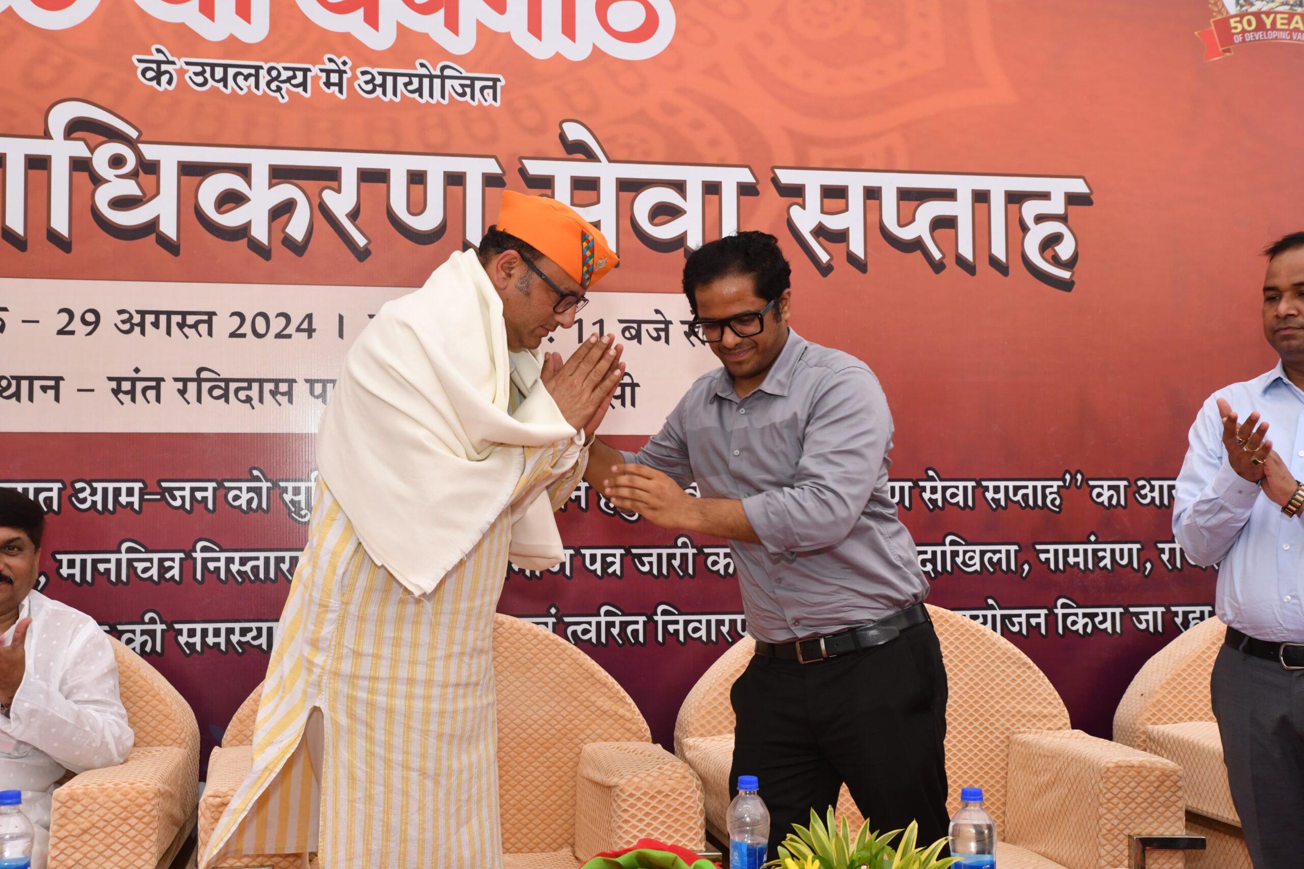 वाराणसी विकास प्राधिकरण अपने 50 वर्ष पूर्ण होने के उपलक्ष्य में स्वर्ण जयंती के रूप में प्राधिकरण सेवा सप्ताह का आयोजन 23 अगस्त से लगातार कर रहा है, जिसके क्रम में आज दिनांक 29/08/2024 को प्राधिकरण सेवा सप्ताह के पंचम दिवस में रविदास पार्क नगवां में कैंप लगाकर जनता की प्राप्त शिकायतों का निस्तारण किया गया l उक्त आयोजन में मुख्य अतिथि श्री सौरभ श्रीवास्तव मा0 विधायक कैंट, विशिष्ट अतिथि श्री प्रदीप अग्रहरी मा0 सदस्य प्राधिकरण बोर्ड, श्रीमती साधना वेदांती मा0 सदस्य प्राधिकरण बोर्ड, श्री अम्बरीश सिंह भोला मा0 सदस्य प्राधिकरण बोर्ड उपस्थित रहें। कार्यक्रम के प्रारंभ में अतिथियों का स्वागत उपाध्यक्ष श्री पुलकित गर्ग द्वारा पुष्पगुच्छ देकर किया गया l जिसके उपरांत जोनल अधिकारी (जोन-4) प्रमोद तिवारी द्वारा सर्वप्रथम मंच से उपस्थित जनता को कैम्प के बारे में जानकारी दी गयी l