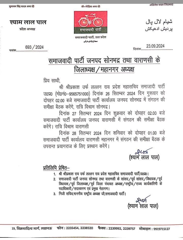 दोपहर 2:00 बजे वाराणसी के समाजवादी पार्टी कार्यालय में संगठन की समीक्षा बैठक आयोजित की जाएगी।